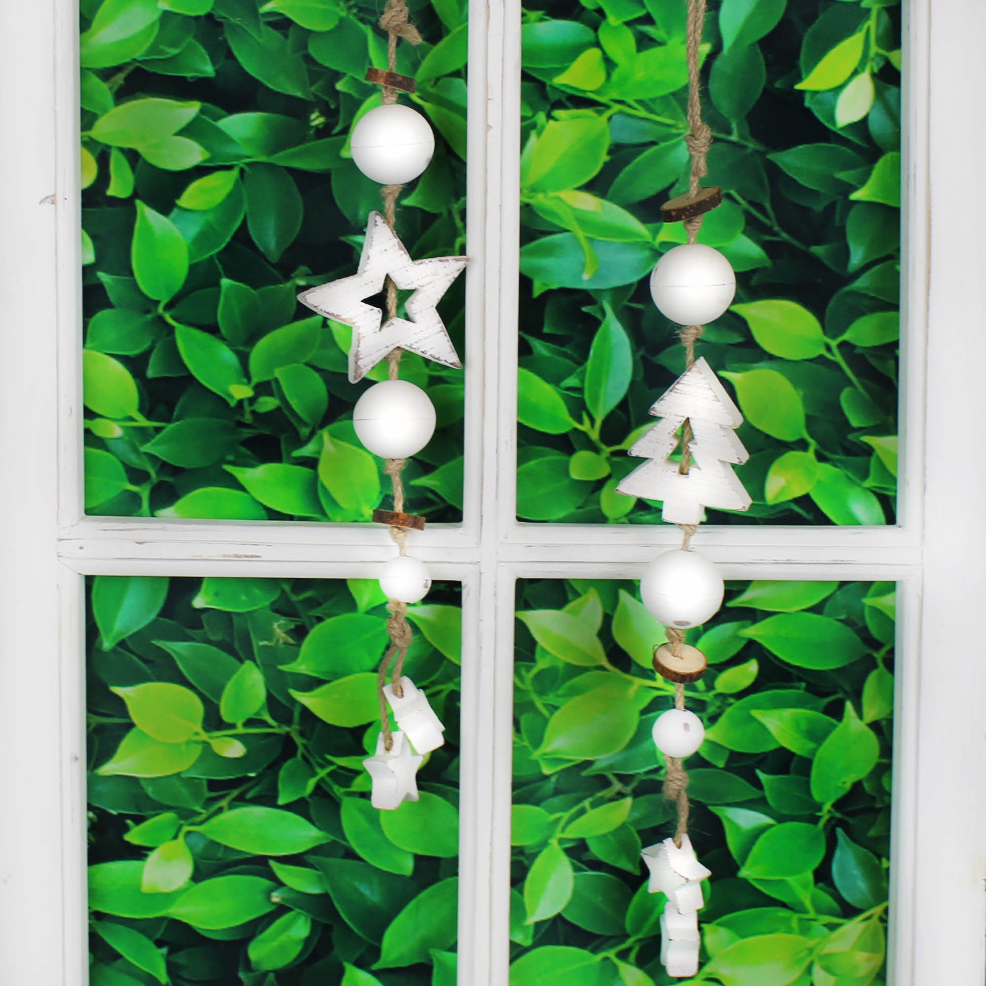 Diese rustikalen Dekohänger sind aus Holz und Metall gefertigt, zur Aufhängung dient ein dekoratives Reisalband. Sterne bzw. Tanne, Kugeln und kleine Holzscheiben bilden eine schöne weihnachtliche Dekoration. Das bearbeitete Holz ist geschliffen und ist an zwei Seiten weiß, die kleinen Holzscheiben sind natur, so bleibt die Holzoptik bestehen. Die Metallkugeln sind ebenfalls geweißt.