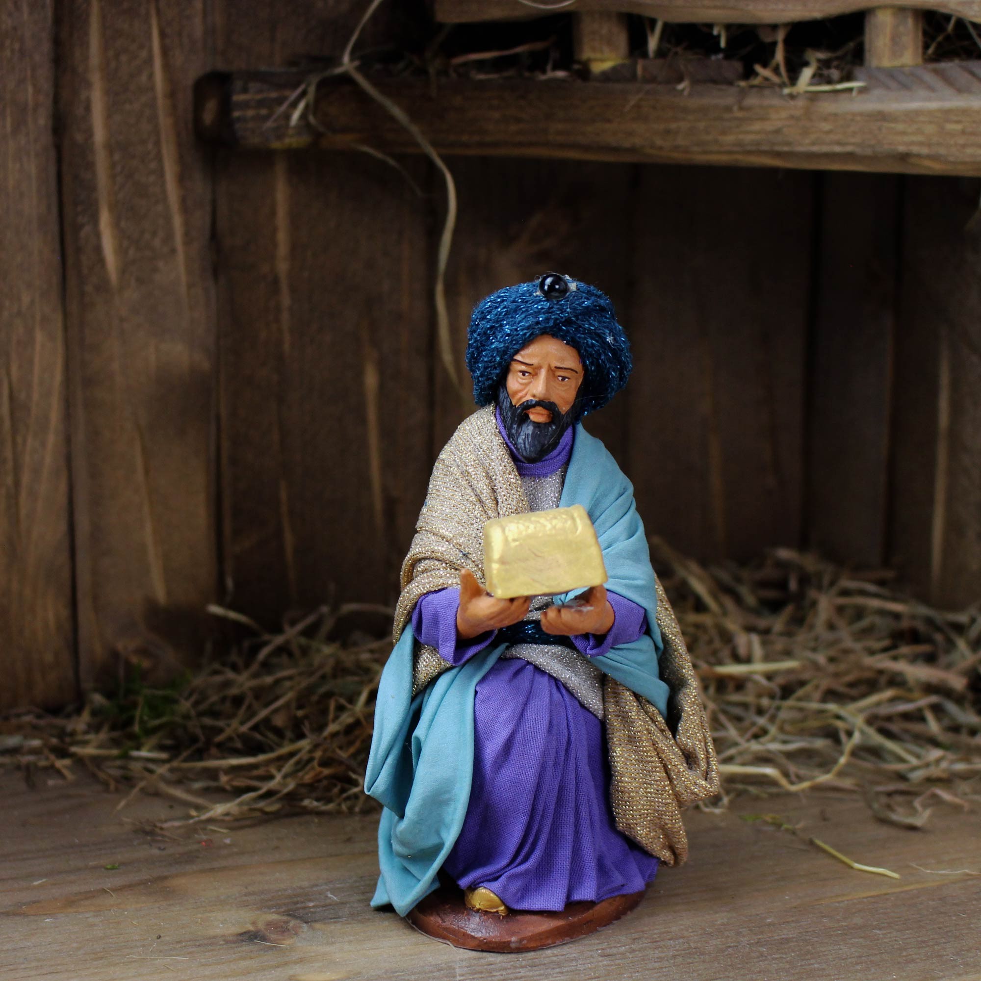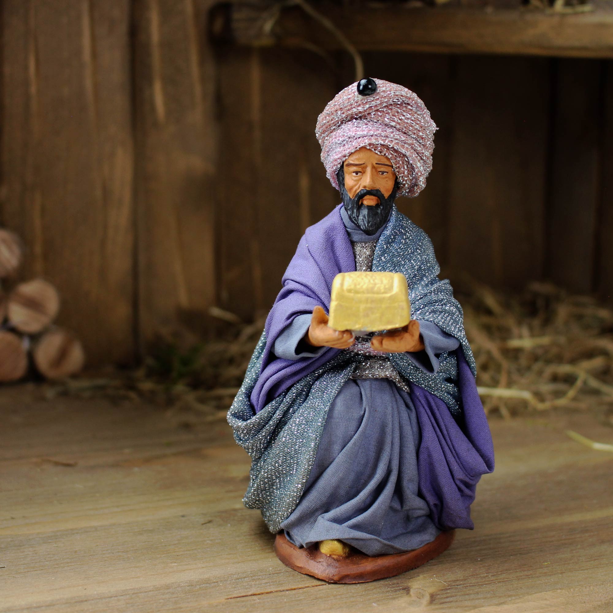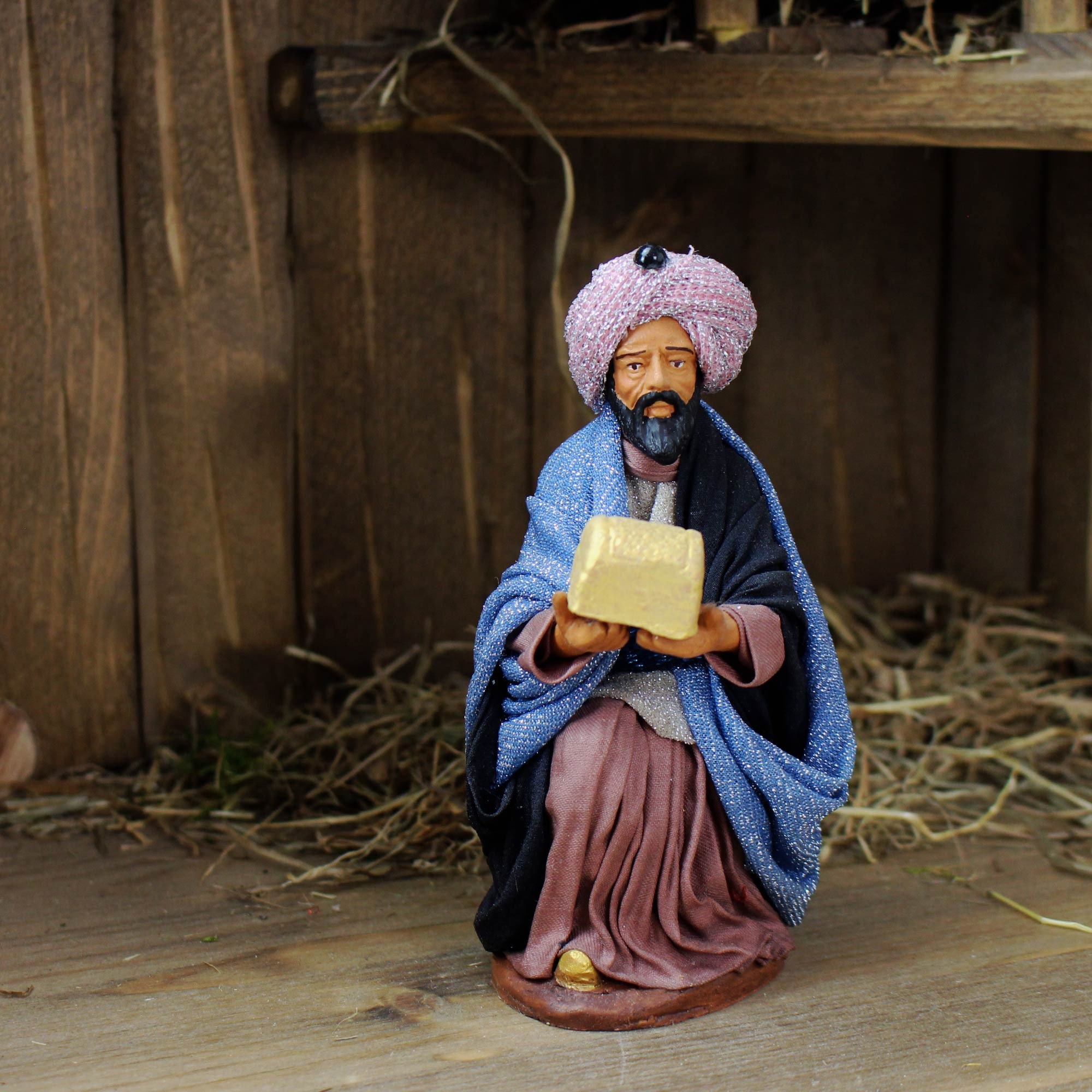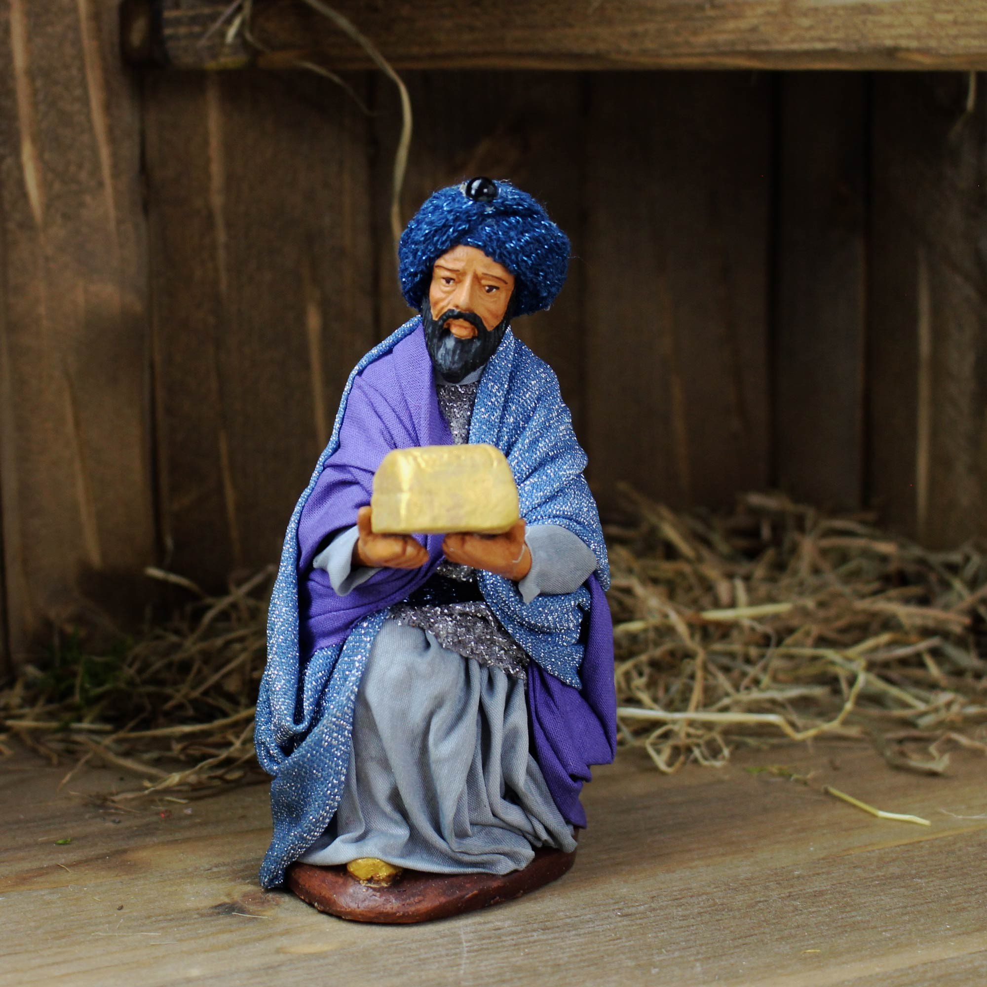 Diese Krippenfigur stellt einen der drei heiligen Könige, auch Weisen aus dem Morgenland genannt, Melchior, kniend mit Gold als Gabe für Jesus, in der Hand dar.
