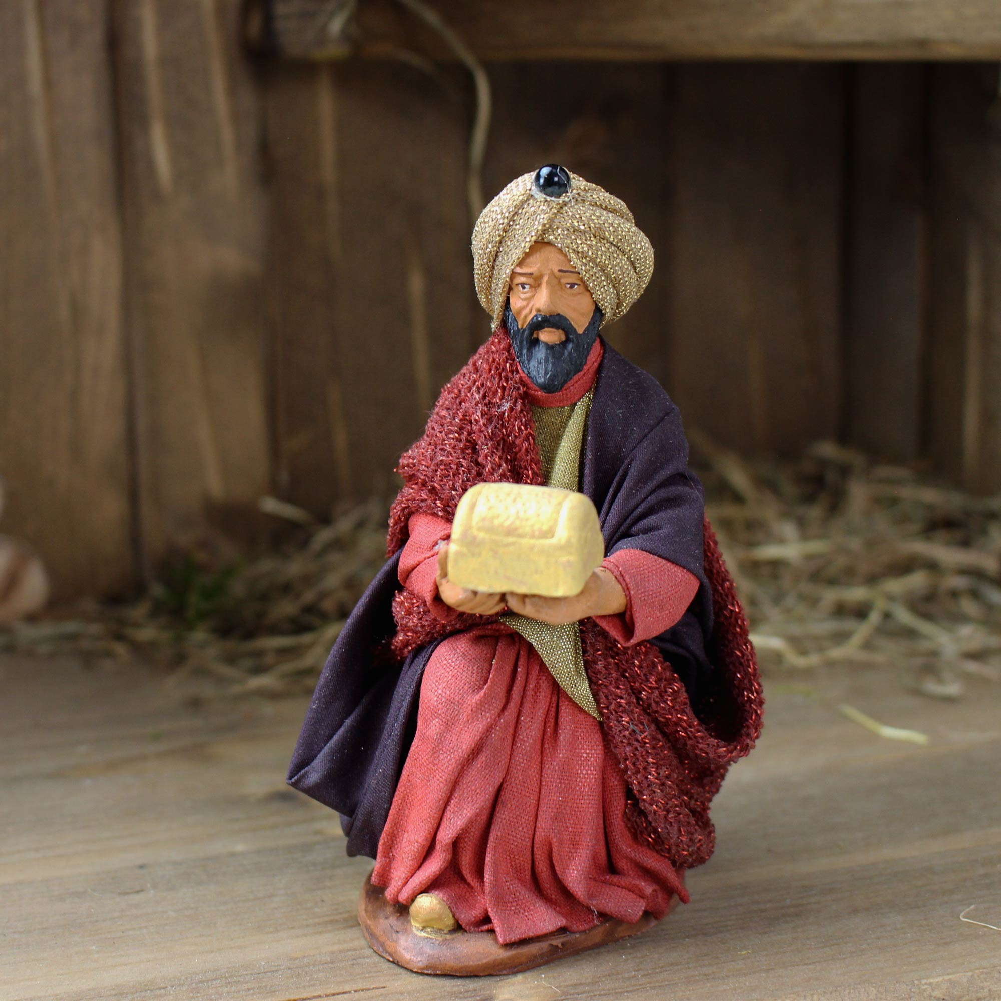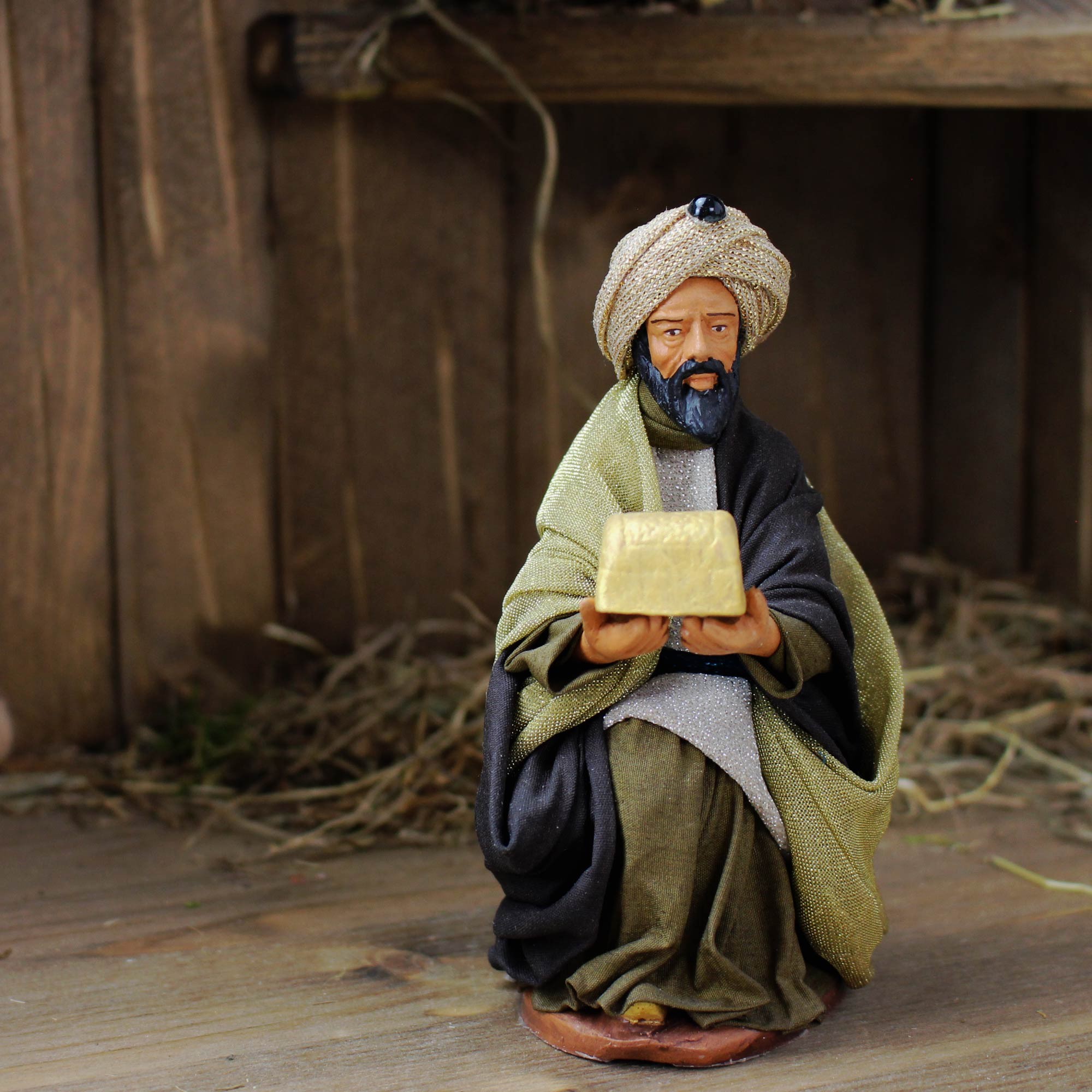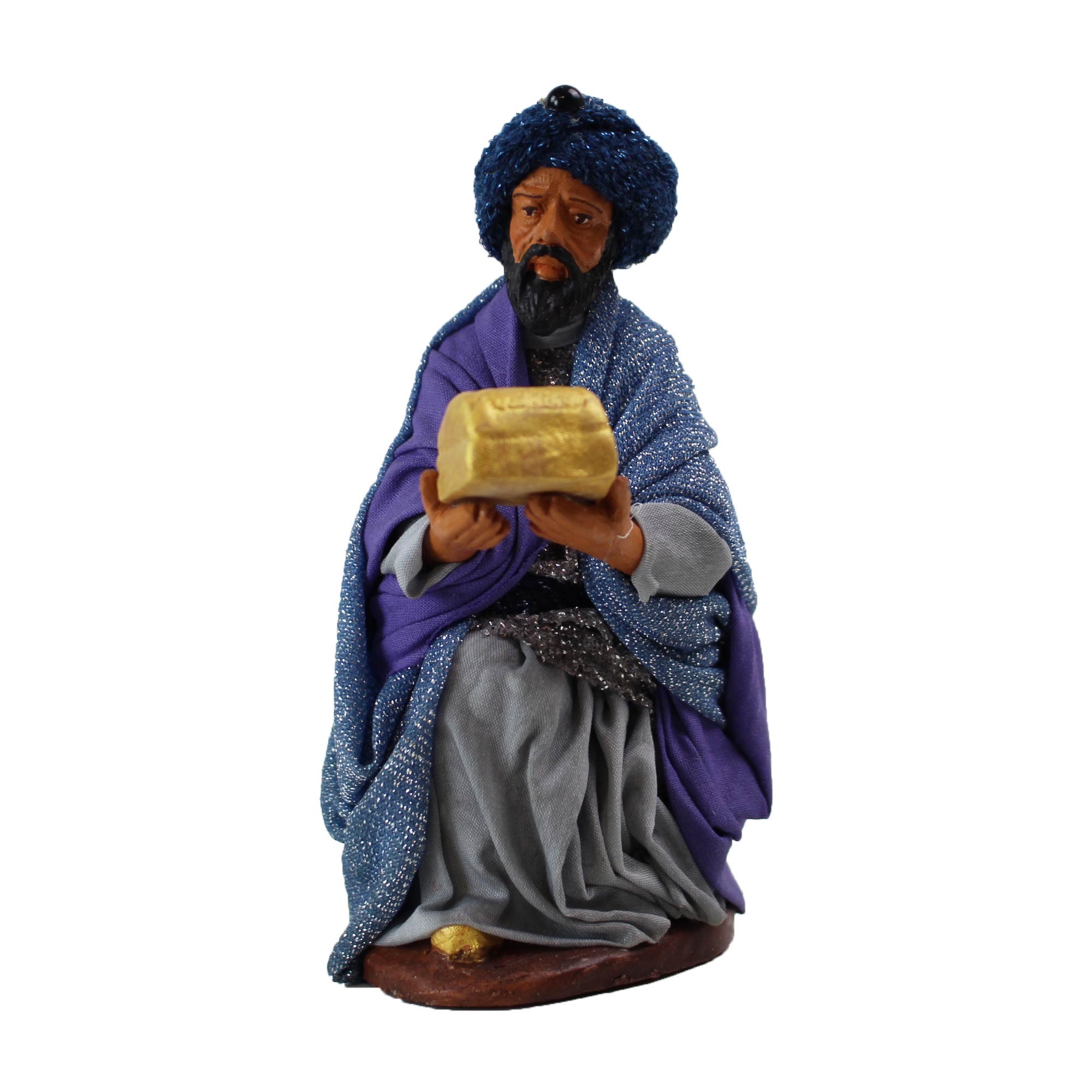 Diese Krippenfigur stellt einen der drei heiligen Könige, auch Weisen aus dem Morgenland genannt, Melchior, kniend mit Gold als Gabe für Jesus, in der Hand dar.