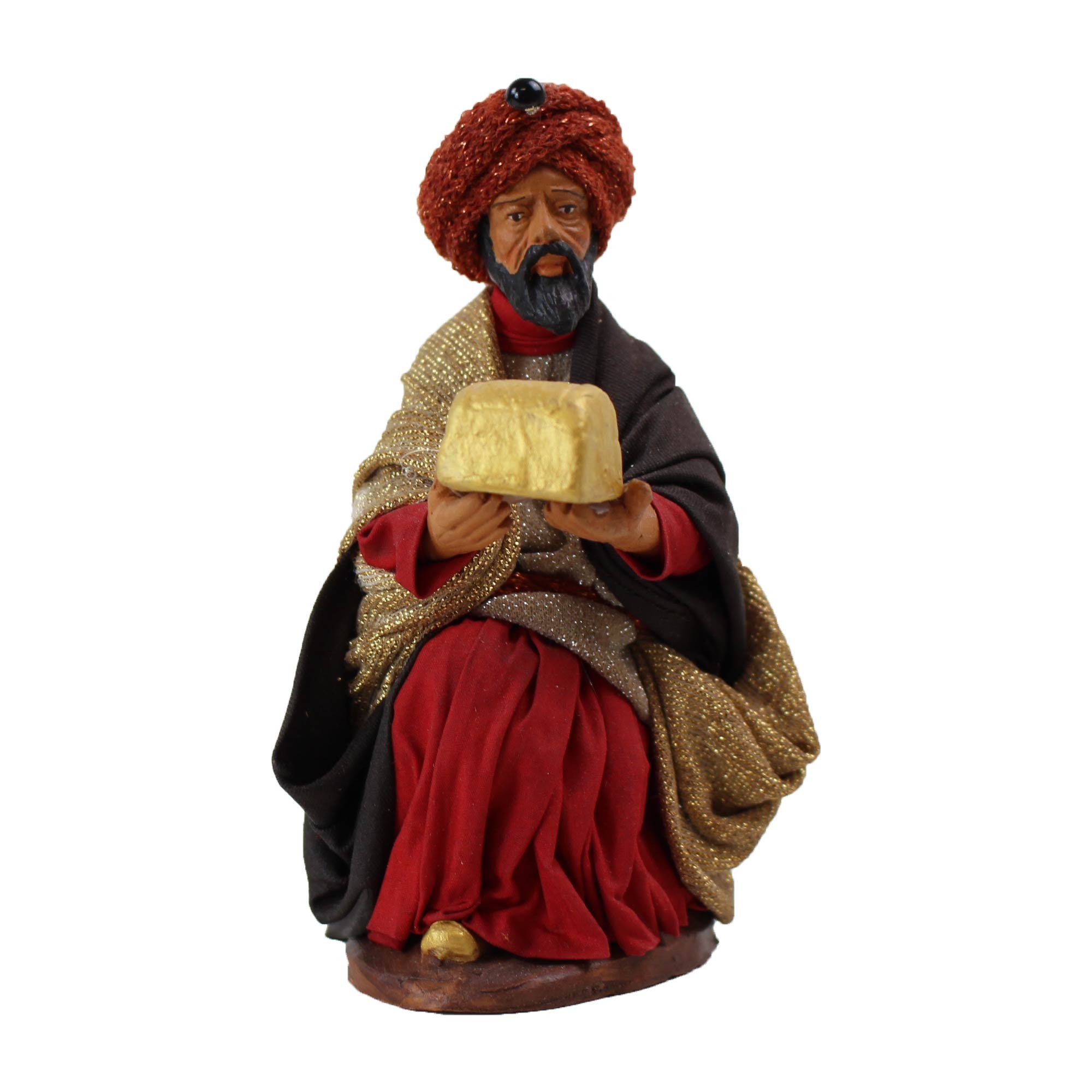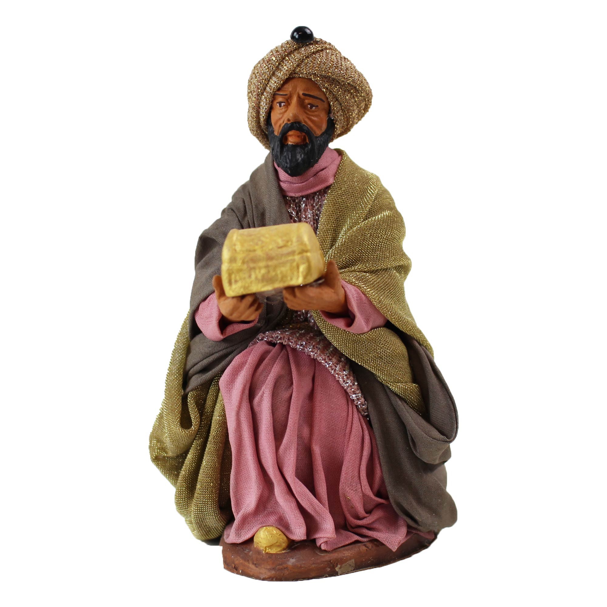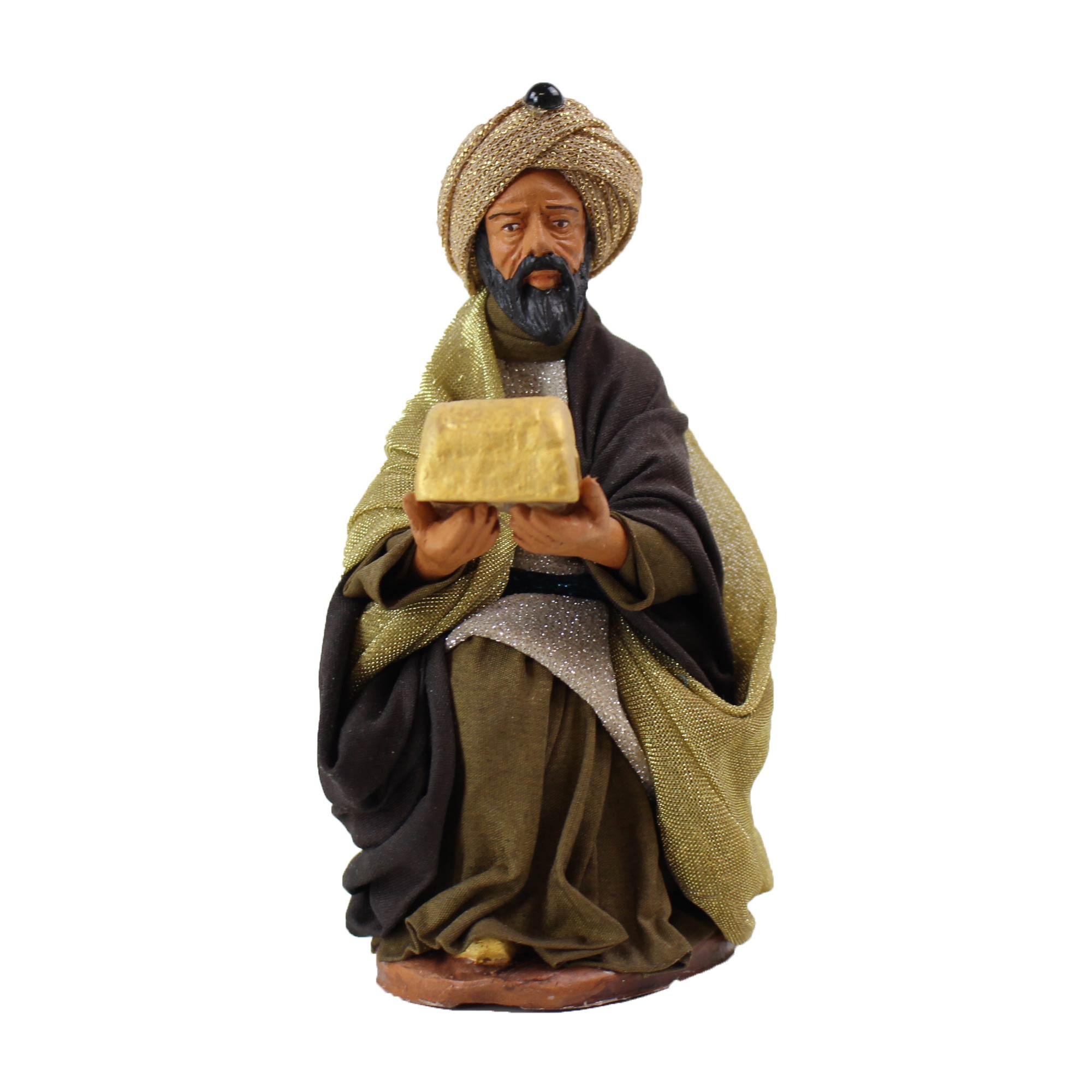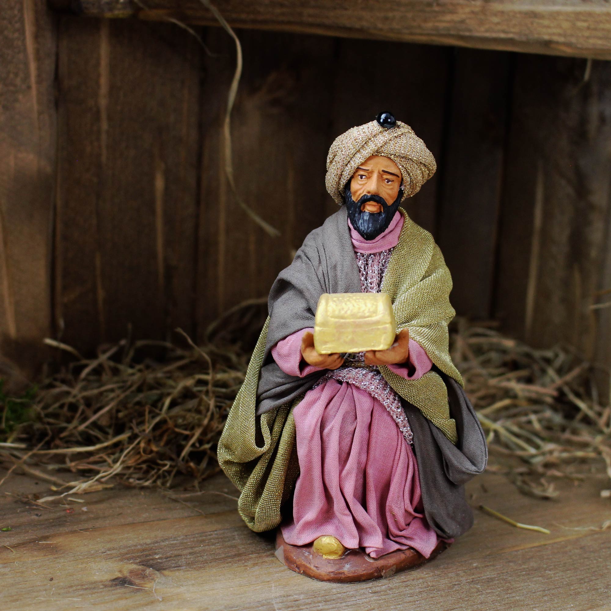 Diese Krippenfigur stellt einen der drei heiligen Könige, auch Weisen aus dem Morgenland genannt, Melchior, kniend mit Gold als Gabe für Jesus, in der Hand dar.