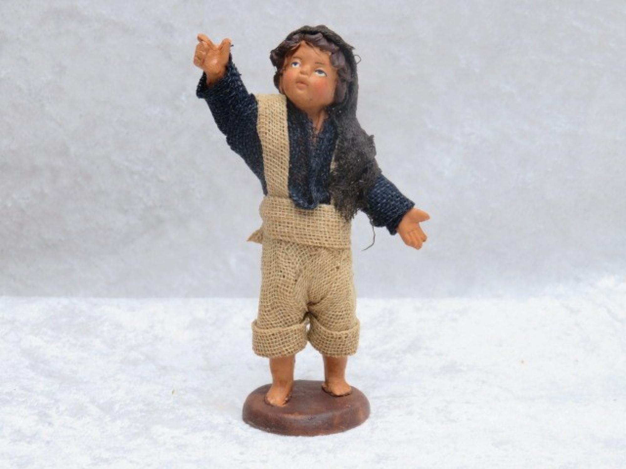 Diese Krippenfigur stellt einen Jungen dar, der nach oben schaut und ein Finger in die Richtung, in die er schaut, streckt.